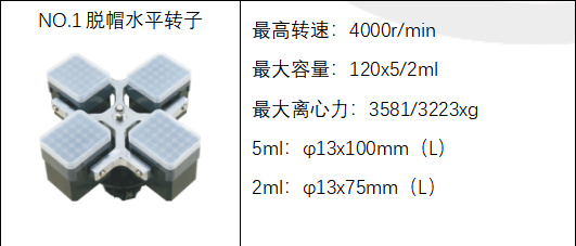 1 | 脱帽水平转子 | 4000rpm | 120x5/2ml | 3581/3223xg |
