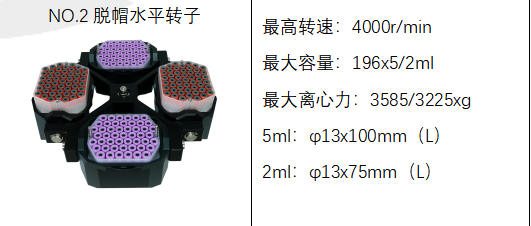 2 | 脱帽水平转子 | 4000rpm | 196x5/2ml | 3585/3225xg |