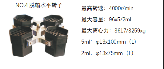 4 | 水平转子 | 4000rpm | 96x5/2ml | 3617/3259xg |