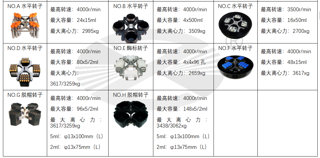 u 配有17种转子,最大可配置148x5/2ml水平转子,并可根据试验要求设计各种适配器,一机多用